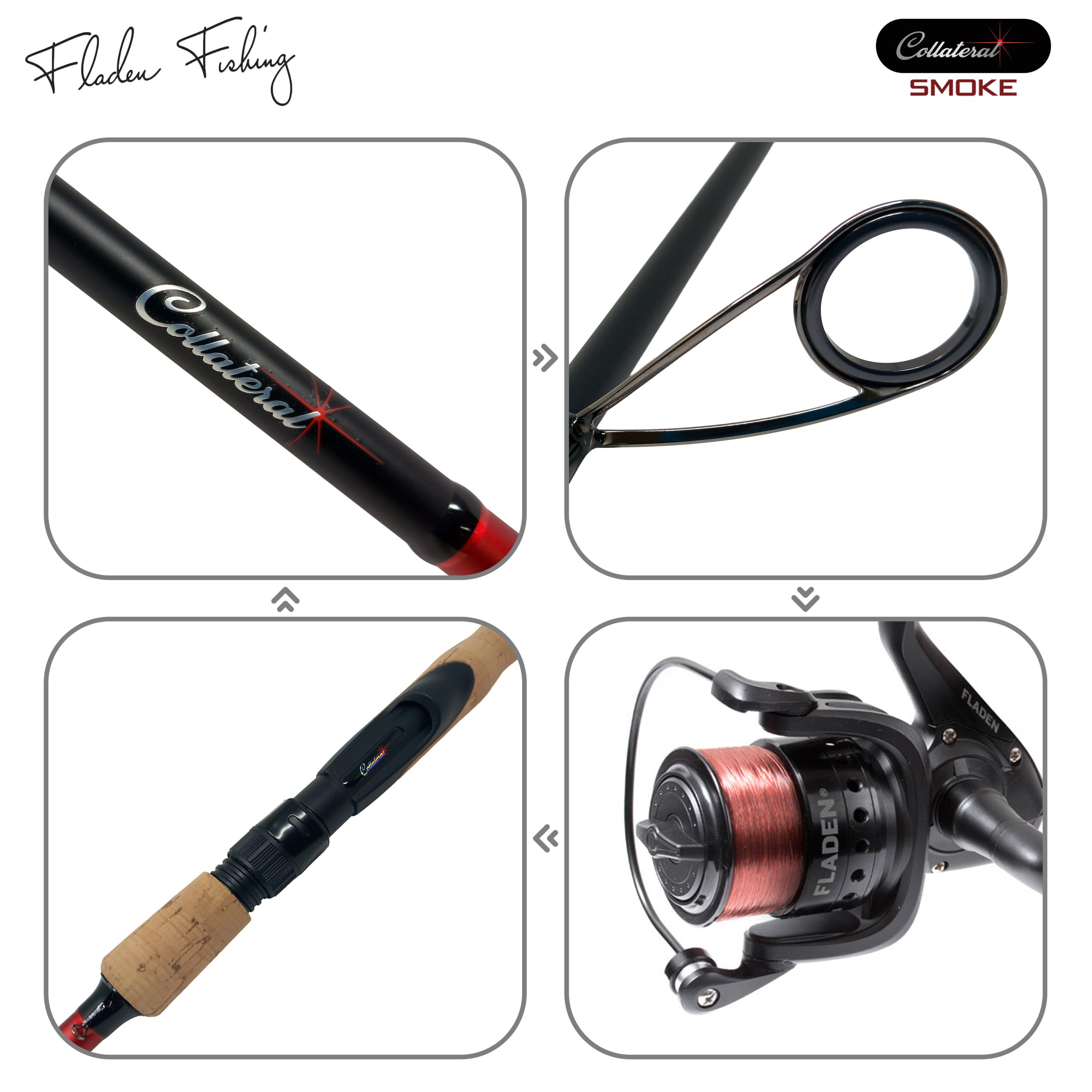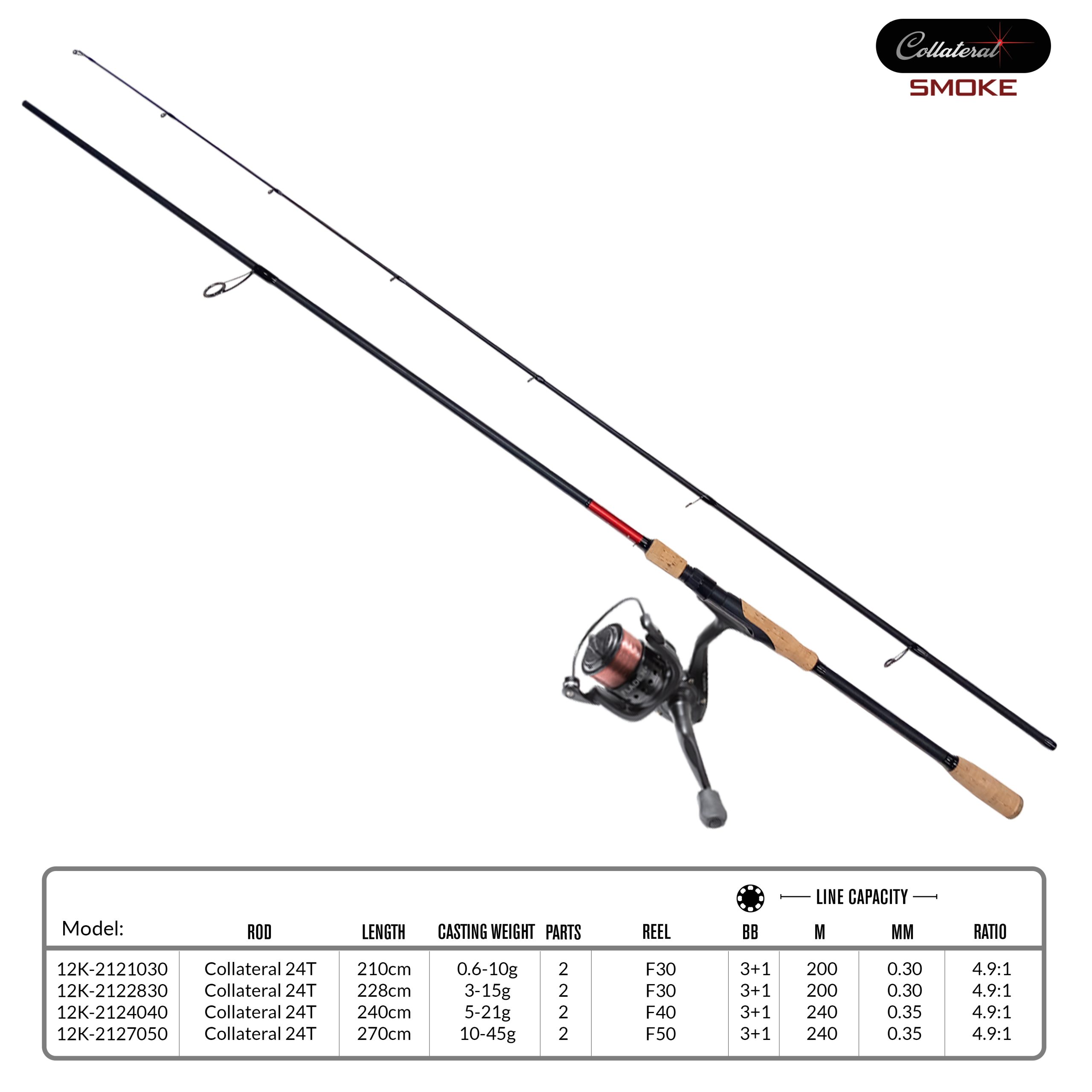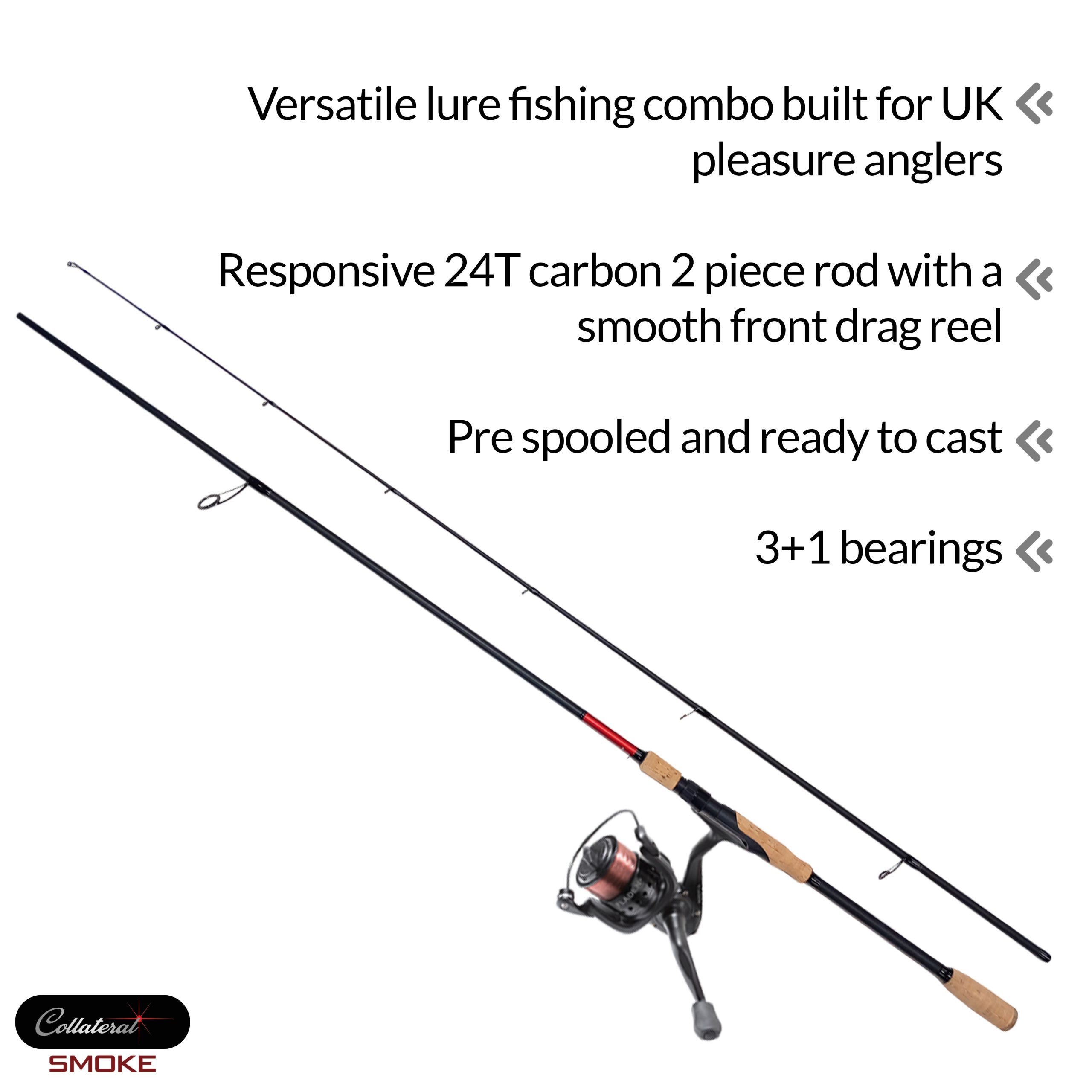 Versatile lure fishing combo built for UK pleasure anglers. The Collateral/Smoke range pairs a responsive 24T carbon 2 piece rod with a smooth front drag reel (3+1 bearings), pre spooled and ready to cast. Available in four balanced setups from ultra light 0.6-10g to powerful 10-45g, each combo delivers reliable performance for canals, rivers, and predator venues alike.