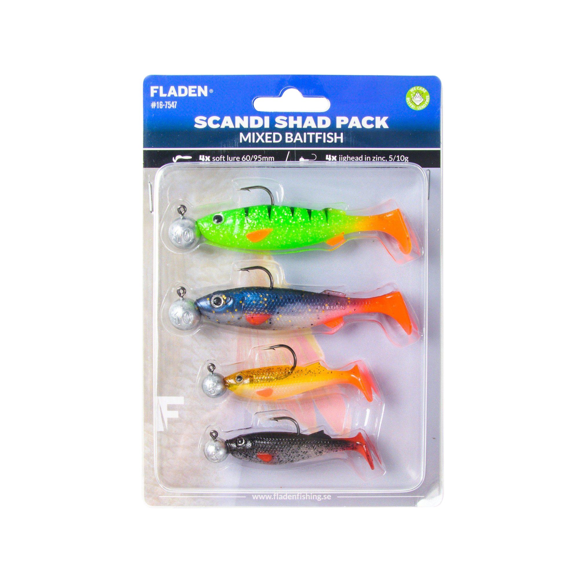 The FLADEN Scandi Shad Pack includes four realistic soft lures in proven baitfish shapes, ready rigged with jigheads for immediate use. Designed for versatile predator fishing in both freshwater and saltwater, these shads range from 6cm to 9.5cm and 5g to 10g. Each lure produces an enticing swinging action that works effectively at slow and faster retrieve speeds, making them ideal for a wide variety of fishing styles and conditions.