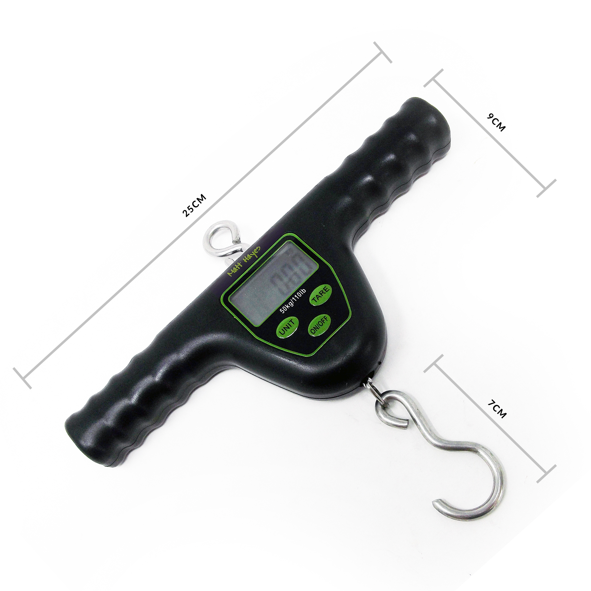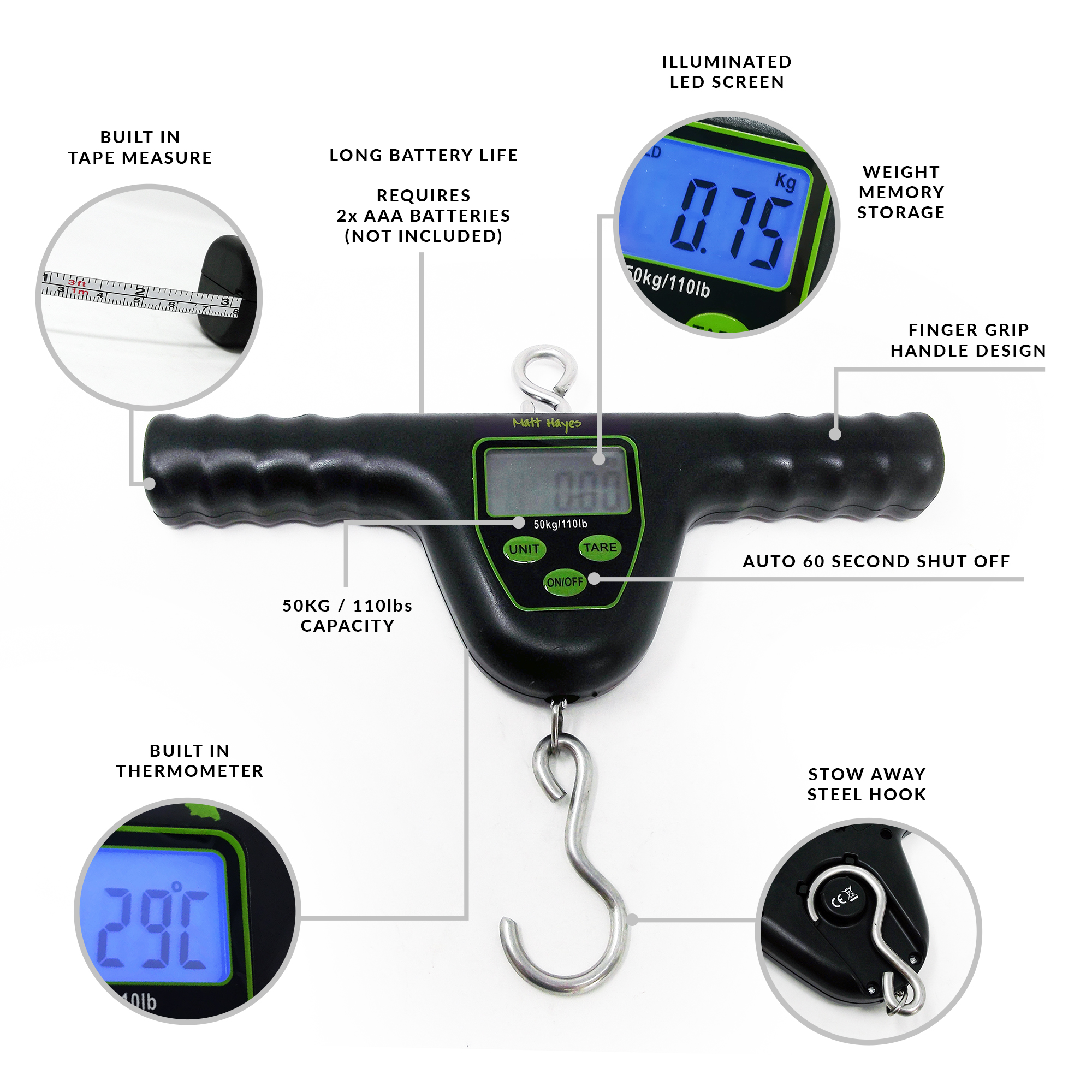 T-Bar style Carp weigh scales with many features. Weighs up to 55kg/110lbs and can be switched between lbs and kgs. Clear, functional, LED display with auto shut off after 60 seconds. Ergonomically shaped handle gives a firm, comfortable grip. A 1m tape measure slides out from the side of the handle. A HOLD function, when selected, gives an audible beep to indicate that the weight has been stored. There is even a function to show the temperature should you wish to note the conditions. Weighs up to 55kg/110lbs and has a strong metal ring for attaching to a tripod, and a hook to attach to a weigh sling.